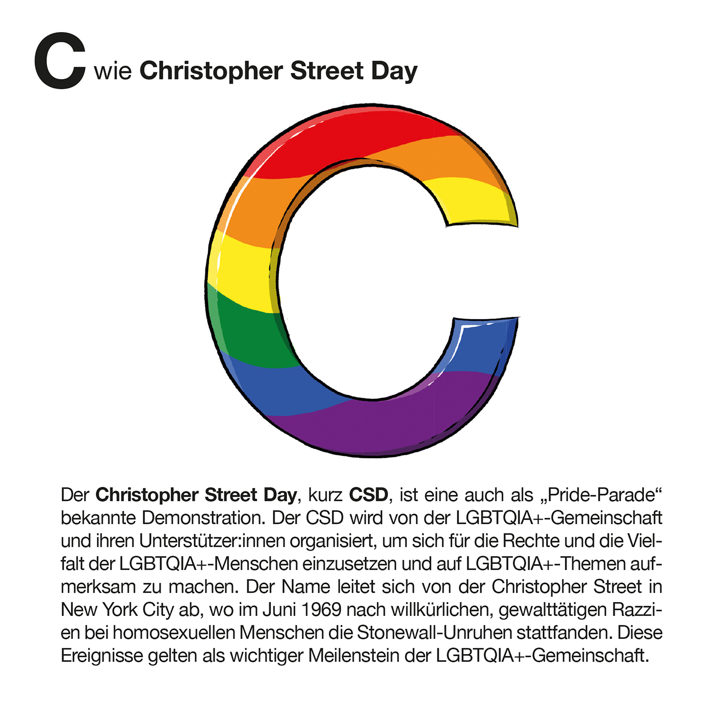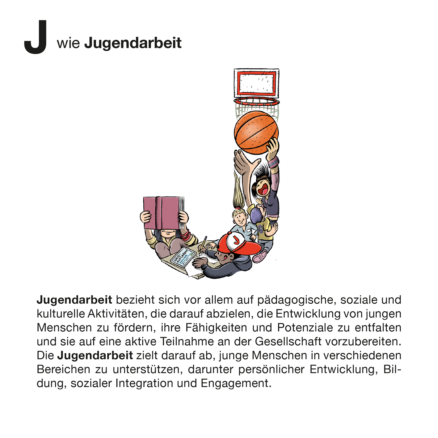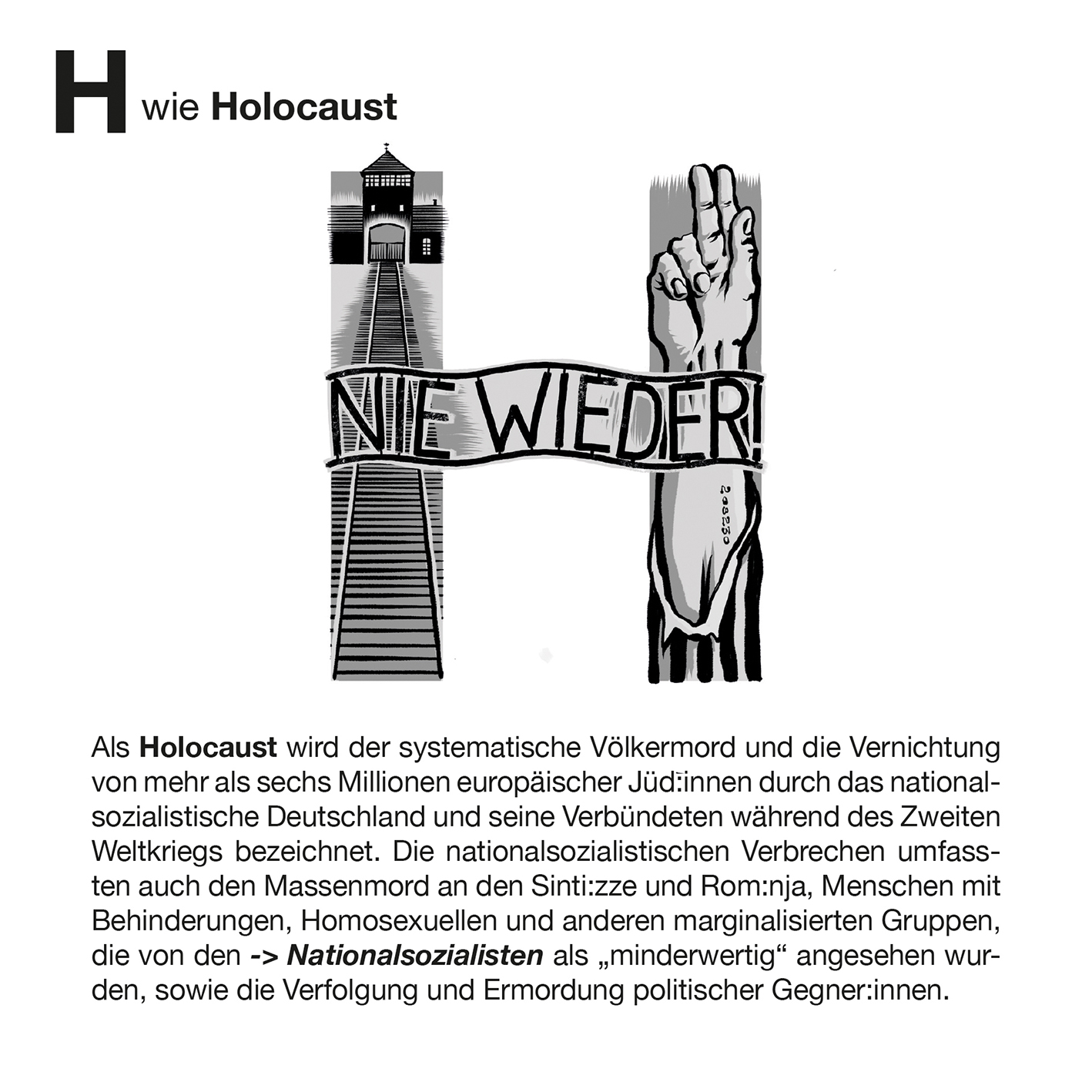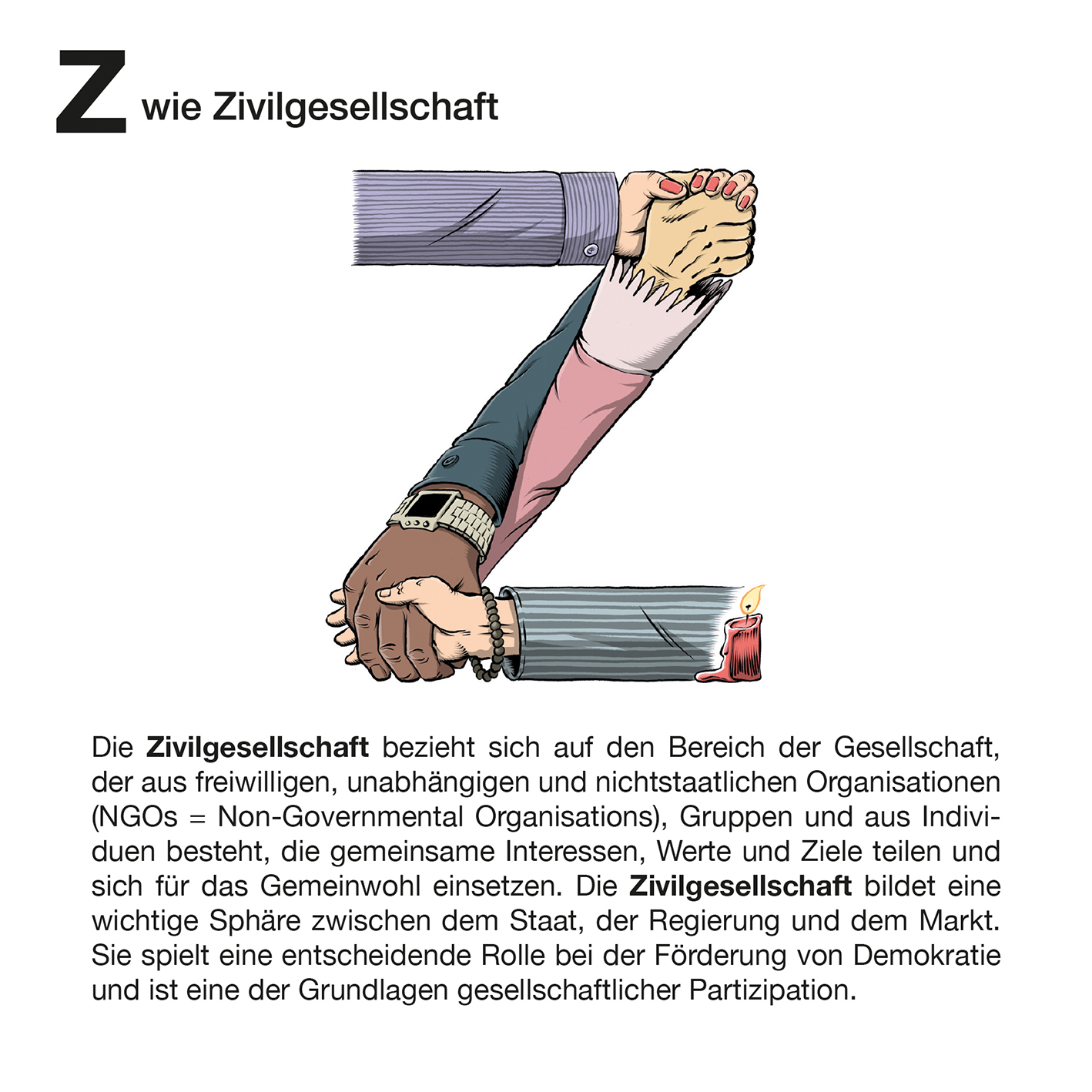 „Zum Tag der Deutschen Einheit 2023 haben Glücklicher Montag (Sandra Strauß und Schwarwel) und die Landeszentrale für politische Bildung Hamburg (LZ) dieses Büchlein und das passende Poster entwickelt. 26 Begriffe zur politischen Bildung: ein ganzes ABC – und so viele weitere Begriffe fehlen! Wie wir ausgewählt haben? Es sind Begriffe, die politische Sachverhalte abbilden, und solche, die Aktivitäten zum Verstehen von Politik kennzeichnen. Auch haben wir vor allem Begriffe eingebracht, die etwas mit den Themen Einheit, Trennung, Vielfalt und Zusammenhalt zu tun haben – Themen eben, die so wichtig sind für die Deutsche Einheit, die am 2. und 3. Oktober 2023 nach 16 Jahren wieder in Hamburg gefeiert wird. Während X ein seltener Buchstabe dafür ist, werden manche von Euch z. B. „Meinungsfreiheit“ bei M vermissen. Nehmt es als Anregung, über Begriffe zu diskutieren, die Euch wichtig sind – wir haben das auch getan und viele weitere gefunden. Ich danke sehr herzlich Sandra Strauß und Schwarwel von Glücklicher Montag für ihre Ideenvielfalt, das Konzept und die wunderbaren Illustrationen. Greta Behrmann, Lilly Fritzsche und Denise Kroker (LZ) sei herzlicher Dank für ihre spontane Mitwirkung, ihre Kreativität und das genaue Hinsehen ausgesprochen. Viel Spaß mit dem ungewöhnlichen ABC!“
